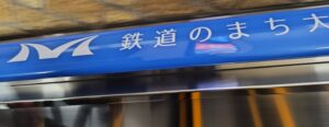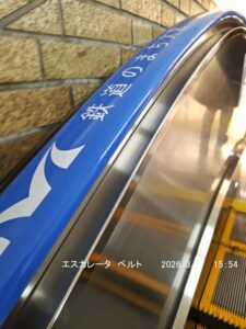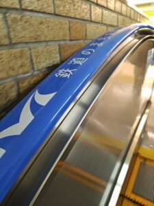 大宮駅のエスカレーターのベルト⇒ 鉄道のまち大宮 と書いてある